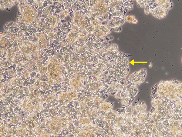 酸素が充分摂取出来ていないフロック(矢印)です。