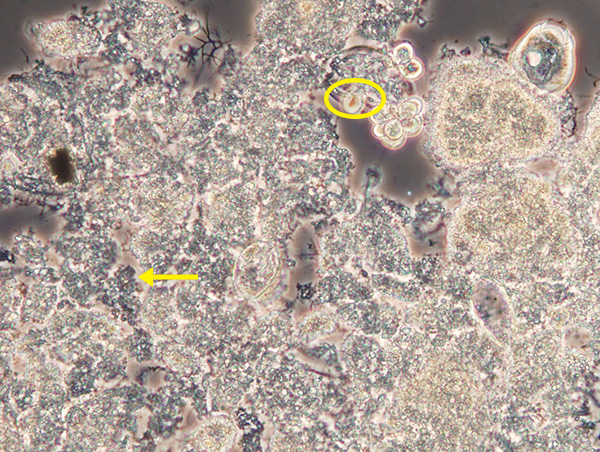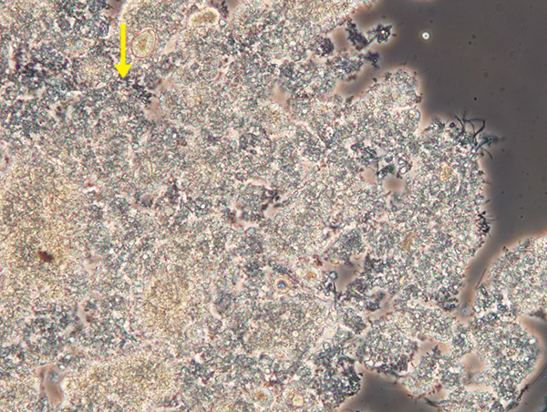 厚蜜性・生物凝集性・纏まりは維持出来ていますが、酸欠の為、粘性フロックが混在して居ります。