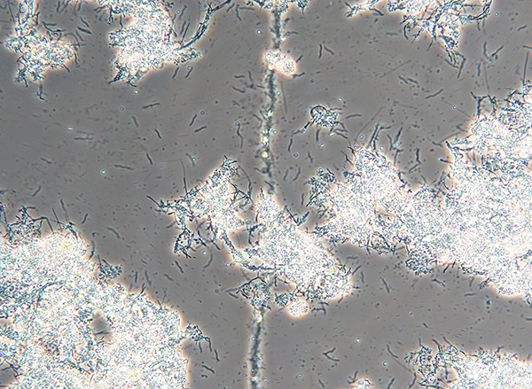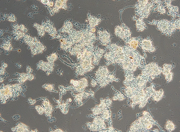 糸状細菌が束に成っています。勢力が衰退している証拠です。糸状細菌が切れて来ています。