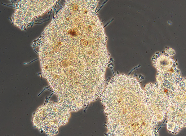 活性汚泥フロックは、活性を持ったフロックに変化しています。汚泥濃度、は未だ、低い数値ですが、生物凝集性が良く成り、沈降性は確実に改善されたフロックです。