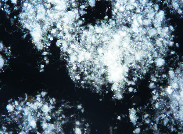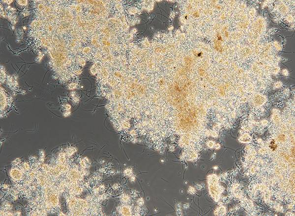 フロックの下敷きに糸状細菌が観察出来ますが、活性汚泥フロックの勢力がある限りは、問題有りませんが、勢力が落ちて来た時に一気に増殖致します。早目の粘性対策を実行して下さい。