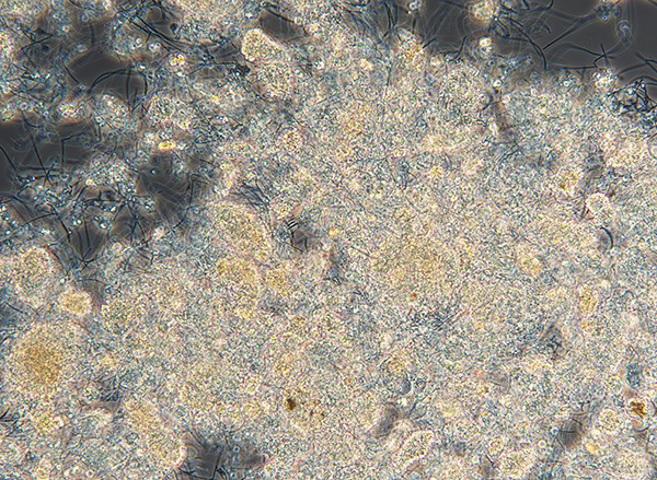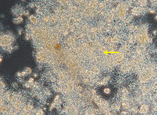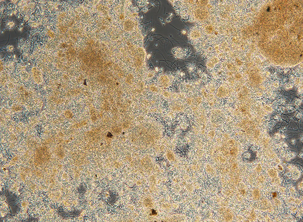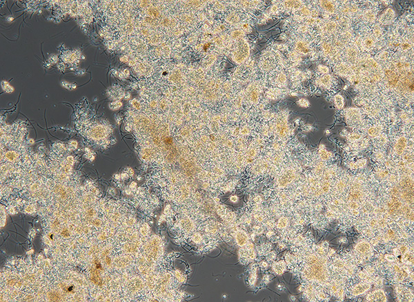フロックの下敷きに糸状細菌が観察出来ますが、活性汚泥フロックの勢力がある限りは、問題有りませんが、勢力が落ちて来た時に一気に増殖致します。早目の粘性対策を実行して下さい。